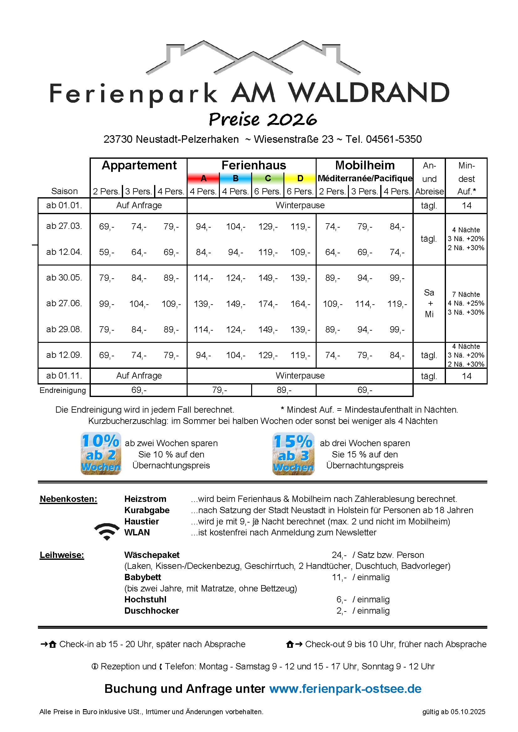 wir haben unsere Preisliste für die Ferienhäuser, Appartements und Mobilheime für die nächste Saison 2026 am 05.10.2025 veröffentlicht.